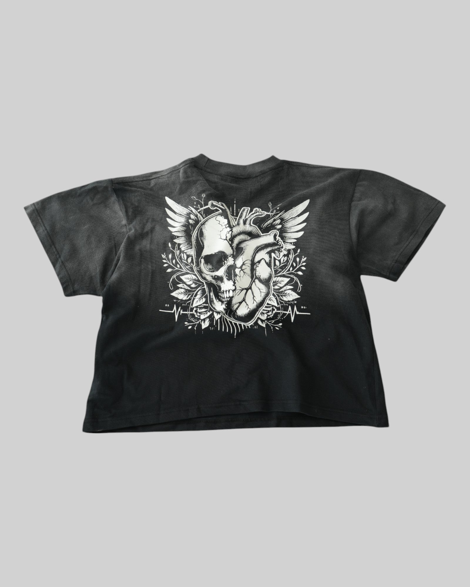 🔹 Backprint: Detaillierte Soul Grafik – ein Mix aus Totenkopf, anatomischem Herz und Flügeln, symbolisiert Leben, Vergänglichkeit und Freiheit