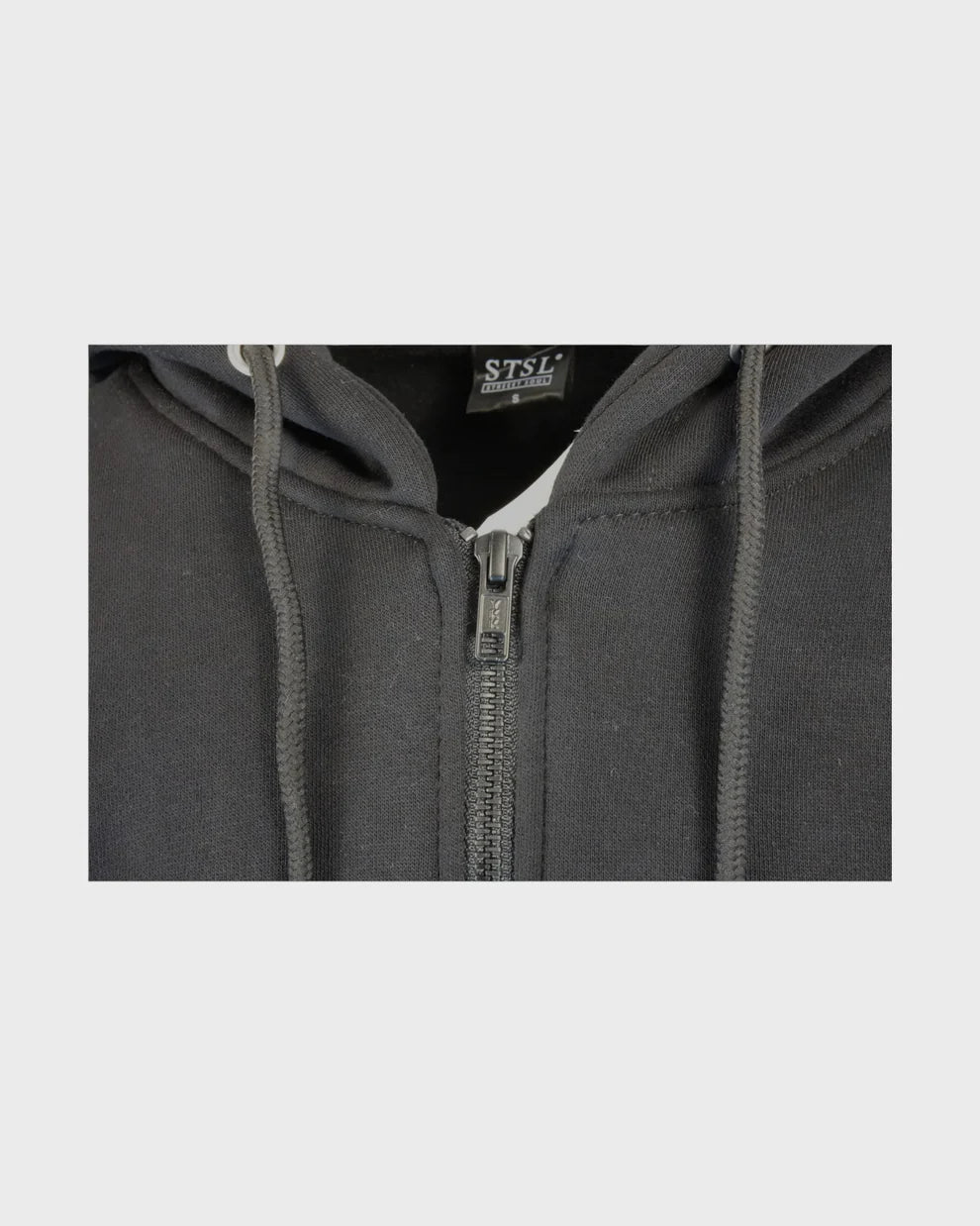 Schlicht. Hochwertig. Zeitlos. Der STSL Zip Hoodie in Eternal Black setzt ein klares Statement für minimalistischen Streetstyle mit maximaler Qualität. Gefertigt aus 100 % reiner Baumwolle und einer Grammatur von 350 g/m², bietet er optimalen Tragekomfort und eine angenehme Schwere – perfekt für jede Jahreszeit.